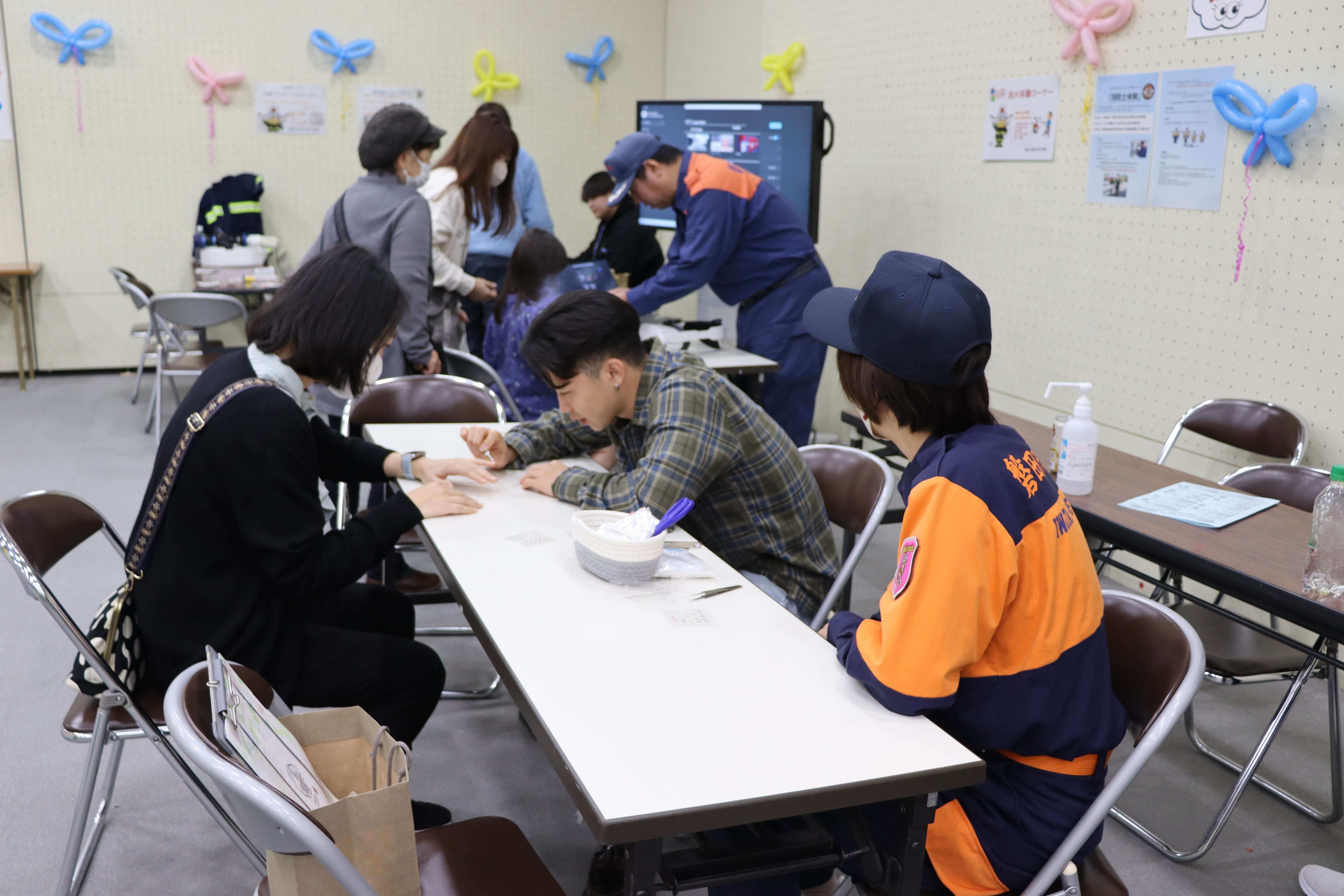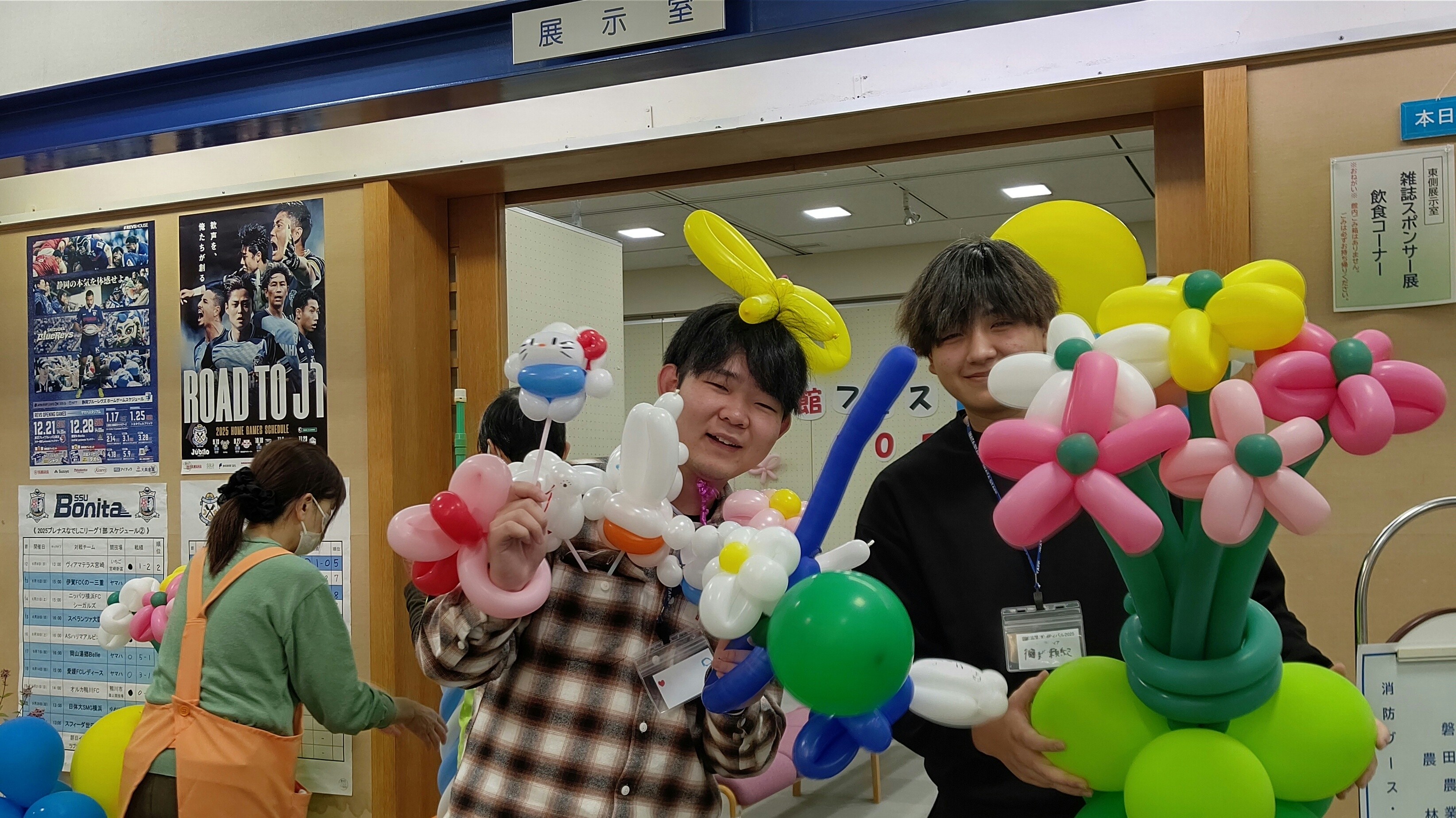 学生は「児童コーナー」や「バルーンアート」、「ボードゲーム」など、その日に実施されるイベントに合わせてそれぞれ分担にわかれ、例えば、「児童コーナー」では子どもたちの折り紙遊びをサポートし、また、「バルーンアート」では参加者に配布するバルーンアートの制作補助や宣伝など、ブース担当者や講師の先生と相談しながら取り組んでいました。参加された方からは「お兄さんが優しく声をかけながら遊んでくれて子どももとても楽しそうだった」とか「こうした活動に大学生が参加してくれて嬉しい」などのお声をいただきました。