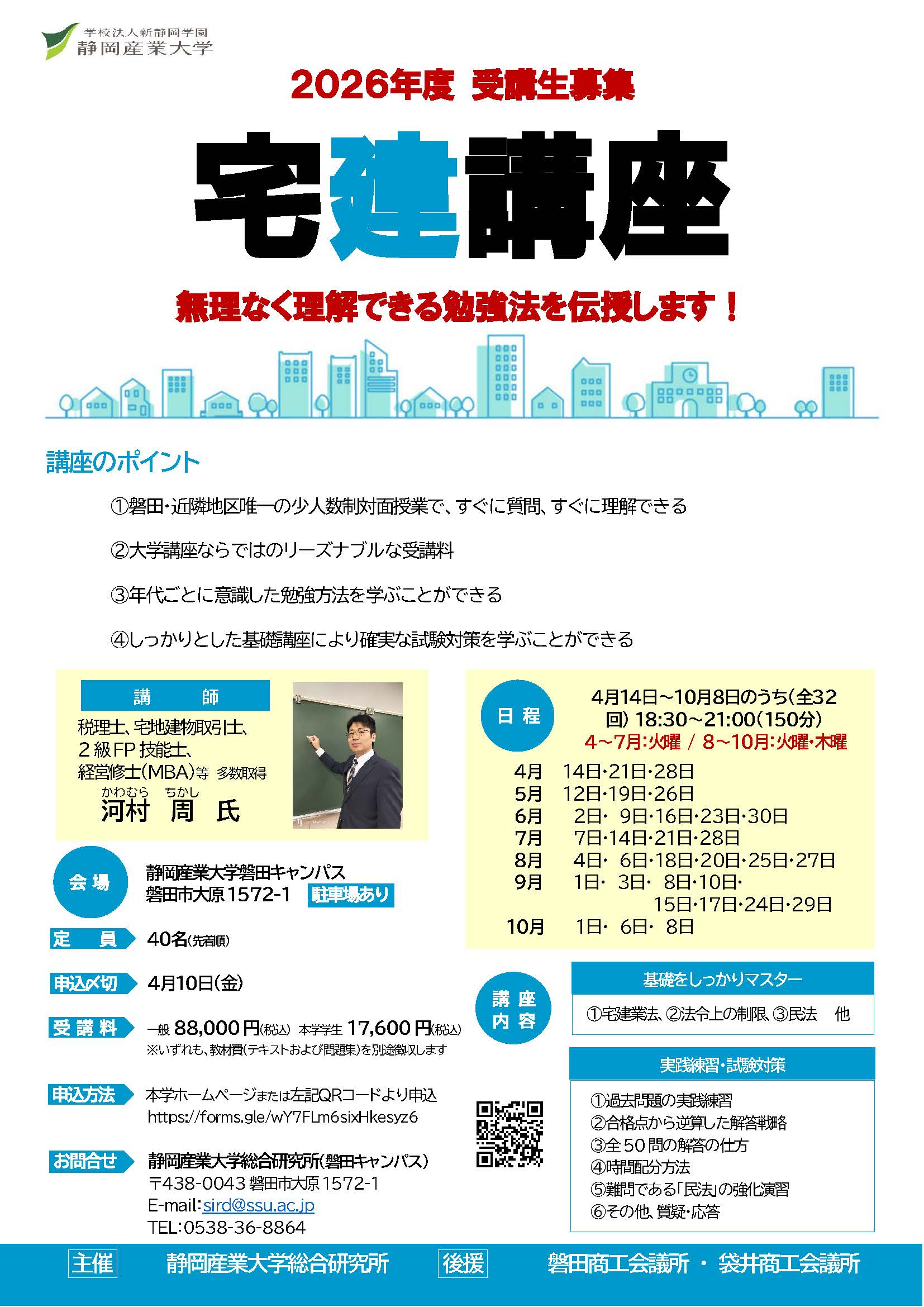 静岡産業大学宅建講座(国家資格:宅地建物取引士講座)を磐田キャンパスにて開講いたします。