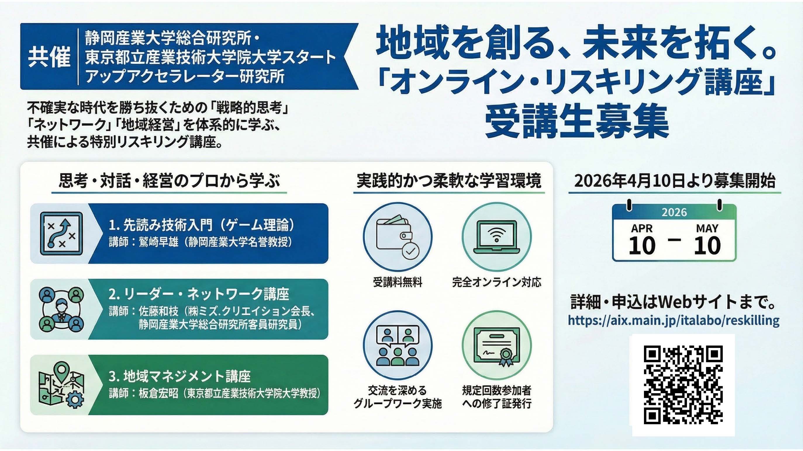 この度、静岡産業大学総合研究所は東京都立産業技術大学院大学スタートアップアクセラレータ研究所と共同で地域社会および企業が直面する複雑な課題を克服し、持続的な成長を実現するために不可欠な「戦略的思考力」「共創型ネットワーク力」「地域マネジメント力」を育成するオンライン・リスキリング講座(無料)を企画いたしました。