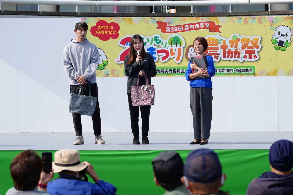 販売開始直後からブースには多くの人が集まりました。新聞記事(太田康雄森町長にかばん完成を報告)やイベント公式サイトを見てこのかばんに興味を持ち、足を運んでくださった方も多かったようです。なかには一澤信三郎帆布のファンで遠方から訪れた方もあり、ブランドの認知度の高さと魅力を実感しました。また、ステージ上でPRの時間をいただき、来場者の皆さんに紹介することができました。