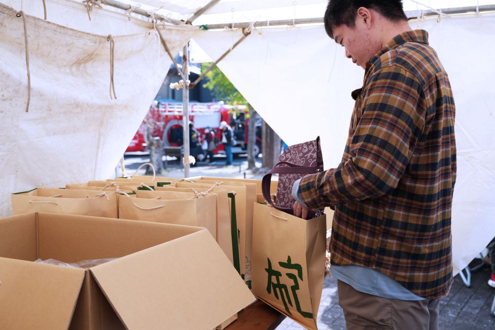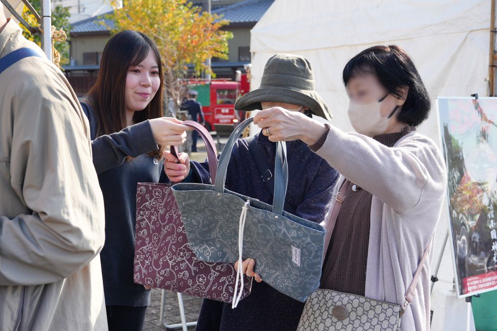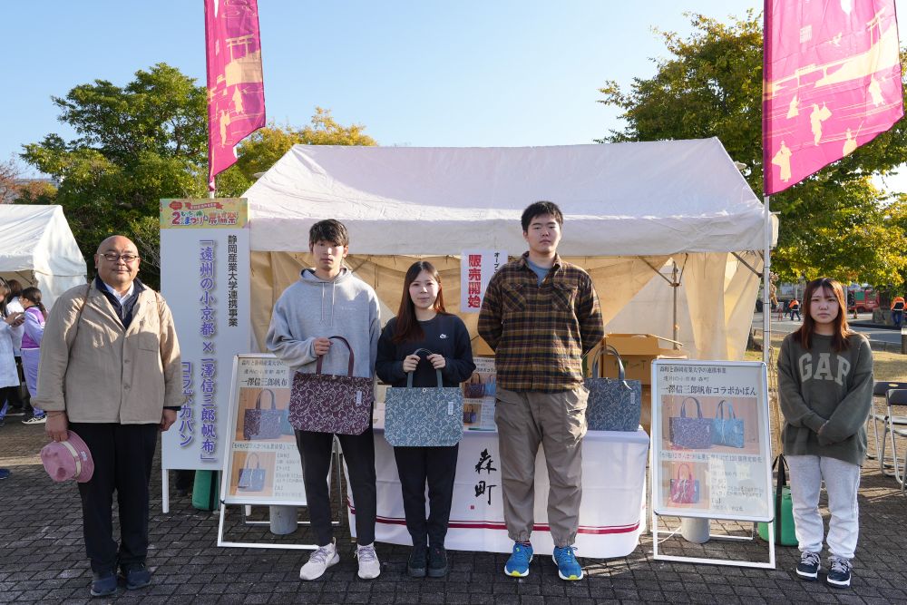 本学の熊王ゼミナールでは、周智郡森町との連携事業として、平成30年から森町オリジナル商品の開発に取り組んでいます。今年度は京都の老舗かばん店「一澤信三郎帆布」と森町オリジナルデザインのかばんを製作。11月16日(日)に開催された第38回森町産業祭「もりもり2万人まつり&農協祭」で、2色各60個・計120個を限定販売しました。森町合併70周年の記念年でもあり、例年以上ににぎわいを見せた会場で、ゼミ生4人(経営学部3年生)が販売をお手伝いしました。