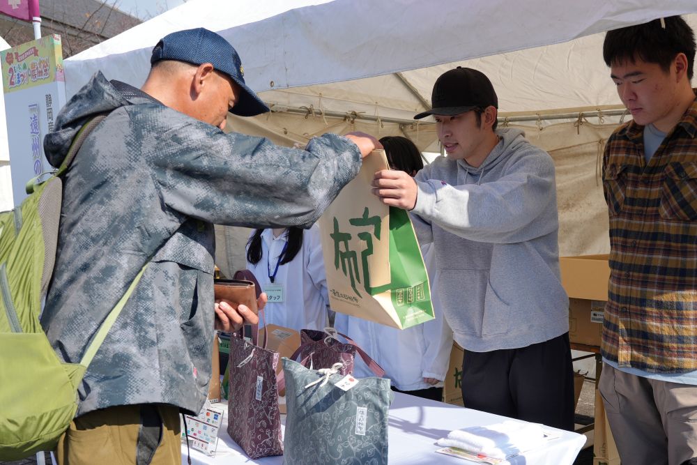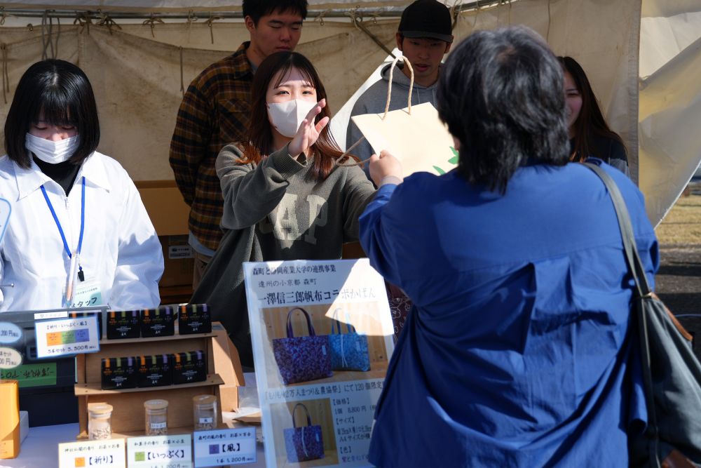 購入者からは「森町オリジナルというのがうれしい」「サザンカの花のデザインが上品でおしゃれ」「軽くて使いやすそう」「柄入りの帆布かばんは珍しくて良い」といった好印象の声が多く聞かれ、「青鼠(あおねず)色が気に入った、自分用にしたい」と話す男性や、2色とも購入し「気分で使い分けたい」「家族で使いたい」という方も。また「地域と学生の連携が興味深い、地方創生にもつながる取り組みだと思う」と、プロジェクト自体に関心を寄せてくださる方もいらっしゃいました。