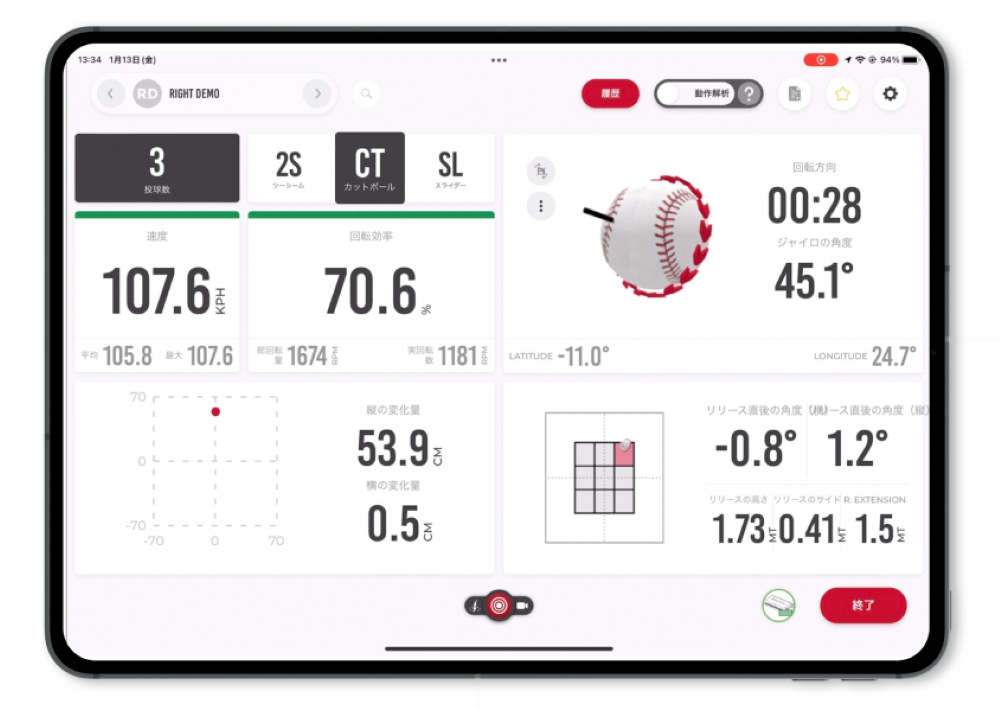 投球時の球速・回転数・回転軸、変化量、ボール軌道などを高精度に計測できるスポーツ分析機器です。