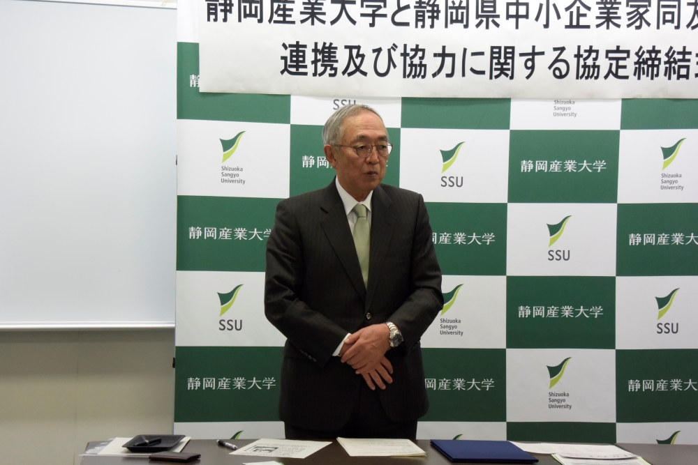 締結式で、堀川学長は「本学では、教育の柱としている”実学教育”を活かして、地域の即戦力になる人材の輩出を目指している。本協定を活かし地域のリーダーである静岡県中小企業家同友会の皆様から実りある学修の機会を提供していただければありがたい。また、本学には多様な専門分野をもつ60人の教員がいるので、共同研究や業務のお手伝いができることがあれば遠慮なくお声がけいただきたい。この協定を契機として、貴会とともに静岡県の人材育成や企業の発展に尽力していく」と協定の活用に関して意欲を示していました。
