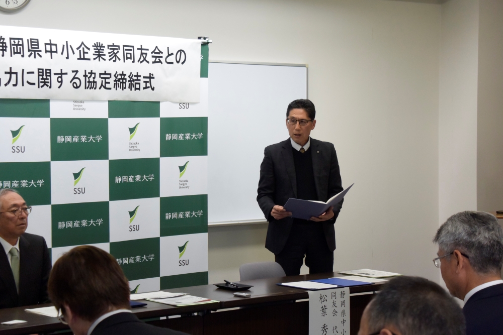 静岡県中小企業家同友会の松葉代表理事は「同友会には企業づくり・地域づくり・同友会づくりの3つのビジョンがある。この考えをもとに地元企業や経済団体と教育機関との関係は、単なる就職支援やマッチングの相手としてではなく、未来をつくるための大切なパートナーであると考えている。今回の連携が、静岡産業大学と同友会とのつながりをさらに深め、生きた学びの場として地域に新しい力を生み出す第一歩となることを願い、同友会としても積極的にかかわっていくことをお約束する」と述べられました。