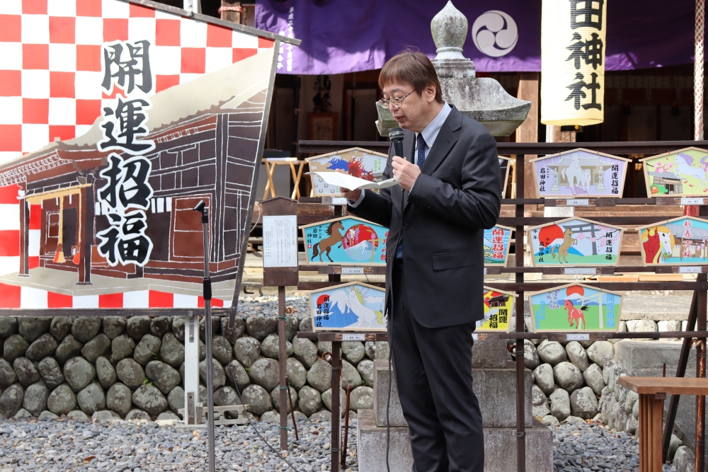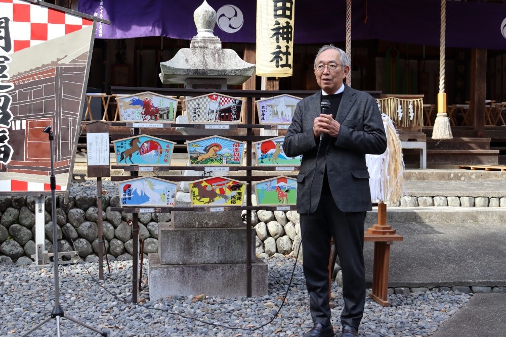 佐野経営学部長からは、「この大絵馬の取組みは経営学部の授業として取り組んでいます。磐田と藤枝、両キャンパスの学生が協力し合い、コンピューターや様々な画材を使用して制作をしています。」と大絵馬制作プロジェクトの詳細が説明されました。