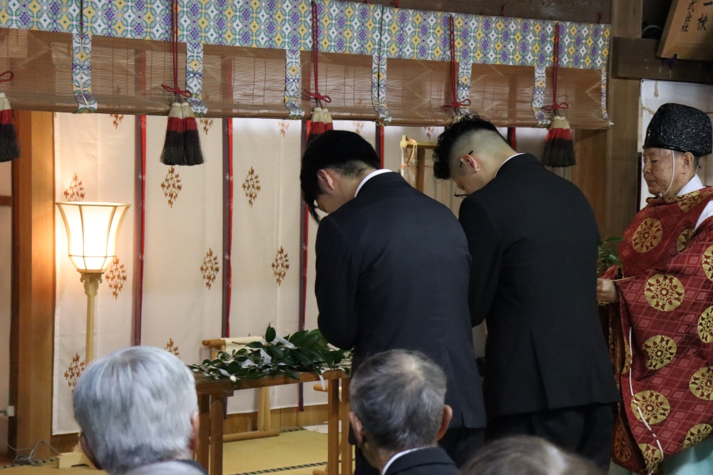 今回の式典では、藤枝市の北村市長や衆議院議員や県議会、市議会議員が数名出席し、本学からは堀川学長をはじめとした教授数名とデザインの考案や絵馬制作に携わった学生が出席し、実際に玉串奉奠などを行い、奉納に関する儀式を執り行いました。
