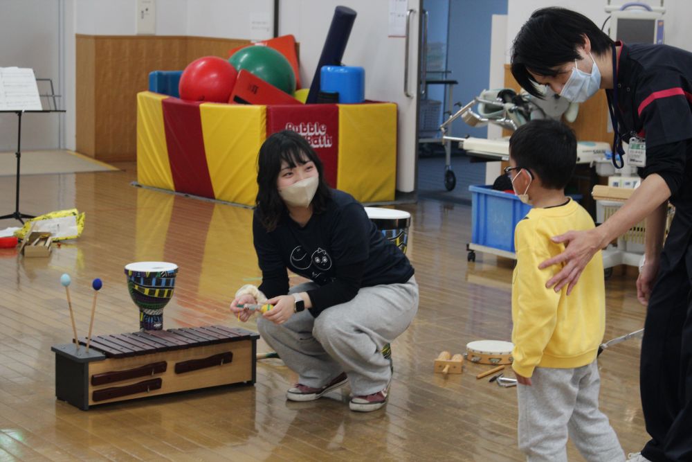 当日は、トーンチャイムによる演奏や、楽器を使って身体を動かしたり、実際に楽器に触れる体験プログラムも実施しました。初めて見る楽器に興味津々の子どもたちは、キラキラした笑顔で楽器に触れて楽しんでいました。