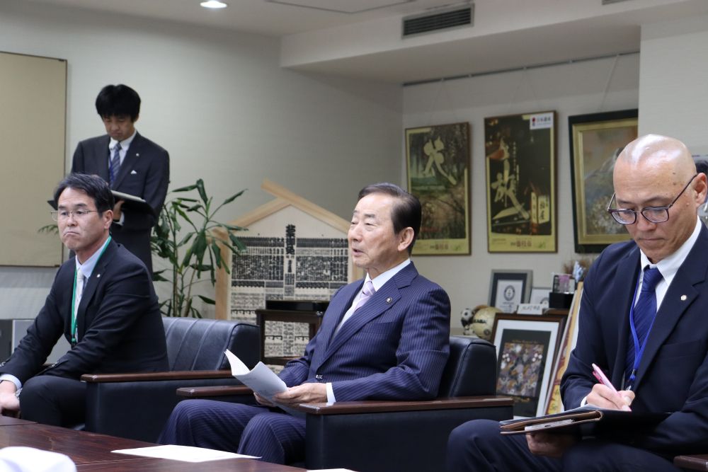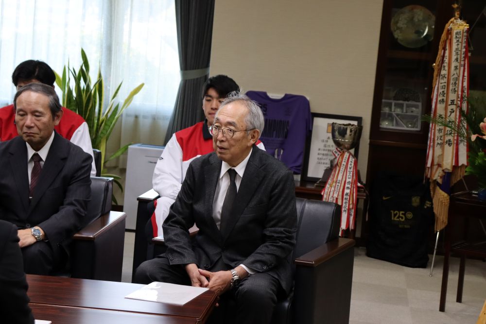 本学からは堀川知廣学長をはじめ、部長の髙橋等、監督の松角翔吾、主将の畑尻祐哉(飛龍高校出身)を含む選手7名の計10名が出席。藤枝市側からは北村市長のほか、スポーツ文化観光部長、スポーツ振興課長が同席しました。