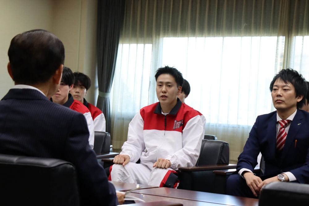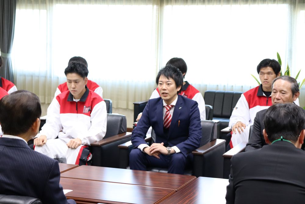 主将の畑尻祐哉選手(飛龍高校出身)は「過去3回とも1回戦敗退となっています。チームの一人一人の個性を生かしたプレーや泥臭いプレーをし、チームの目標である全国大会で1勝をできるように頑張りたいです。最後にこのような機会を作っていただきありがとうございます」と力強く決意とお礼を述べました。