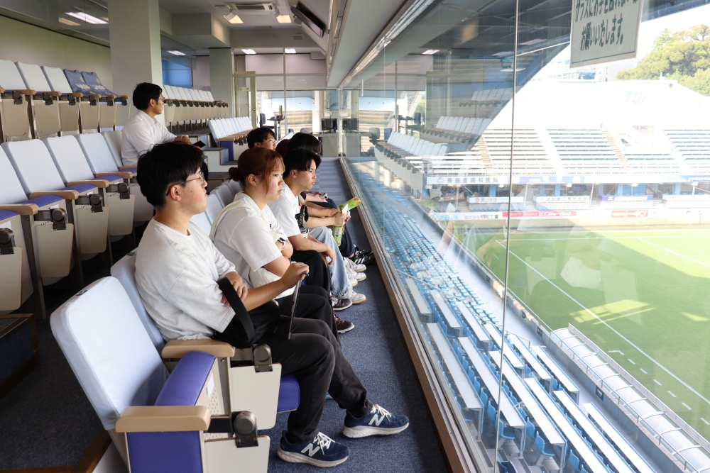 本ツアーでは、本学スポーツ科学部内に設置されているスポーツチームマネジメントプログラムを履修している学生や、塩梅講師のゼミナールに所属している学生など合計6人が参加しました。ツアー中はジュビロ磐田の広報担当の方に、スタジアム内各場所における担当者の業務や工夫している点などを説明してただきました。参加者は、試合運営に関わる様々な職種と実務について実地で学びました。