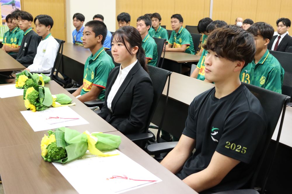 当日は、試合や発表の映像が会場に映し出され、学長からの祝福メッセージも上映されるなど、喜びと誇りに満ちた雰囲気の中で式典が進行しました。