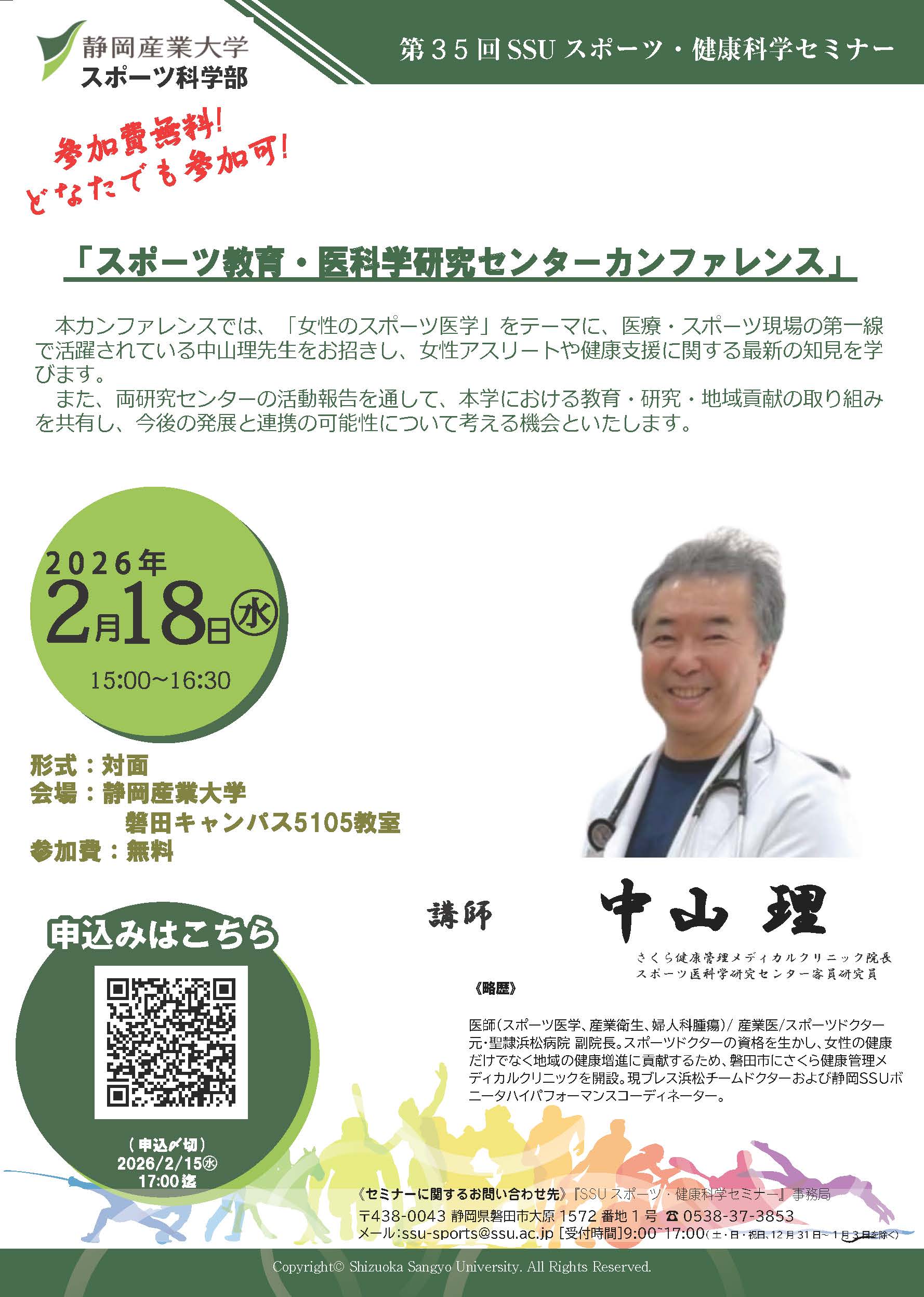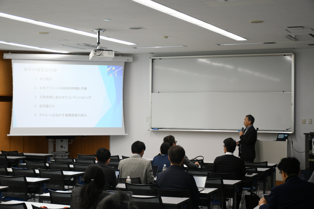 第35回SSUスポーツ・健康科学セミナーでは、「女性のスポーツ医学」をテーマに、女性アスリートの健康課題やコンディショニング支援の重要性についての講演が行われました。中山理先生をお招きし、女性特有の身体的特徴や月経周期とコンディションの関係、スポーツ現場における医科学的サポートの実際について、臨床経験を踏まえてご講演いただきました。