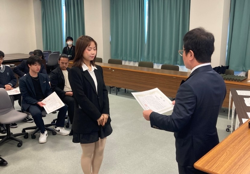 このプログラムは、藤枝キャンパスの外国人留学生を対象に、学内や学外の諸団体の実施した各種の国際交流活動に貢献した学生に対して東名自動車学校様から奨学金を支給していただくもので、外国人留学生対象となってからは今回で8年目。東名自動車学校様からは、これまでにも全学生を対象とした作品コンクールや学園祭のイベントに対し奨学金プログラムを実施していただいており、通算では今回が20回目となります。