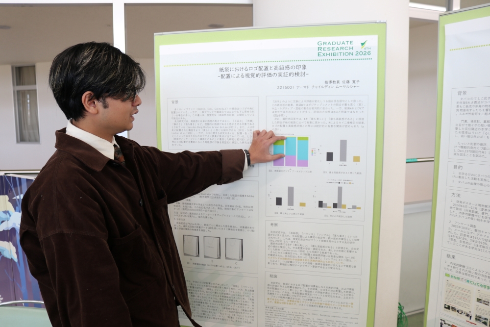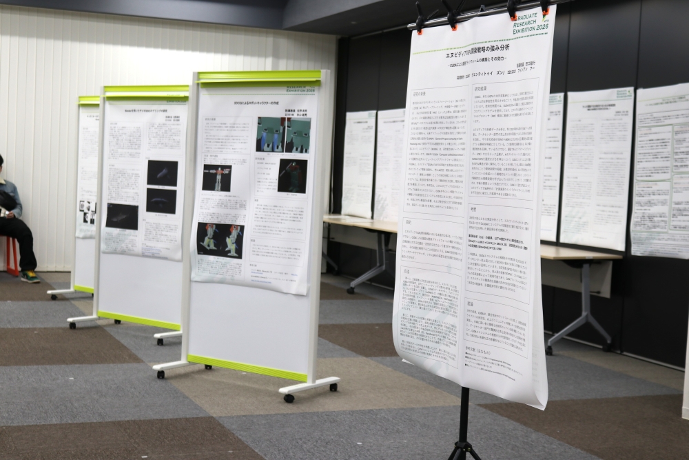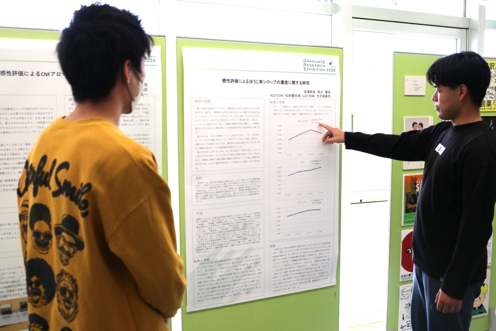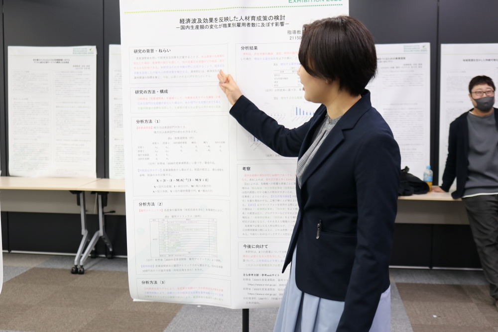 研究テーマは、経済分析の結果をビジネスに応用した研究をはじめ、3DCGを活用したデザイン制作、地域課題の解決に向けた提案、感性工学の視点を取り入れたものづくりの研究など多岐にわたり、全50テーマが発表されました。なかには、口頭発表とポスター発表の双方にチャレンジした学生もいました。
